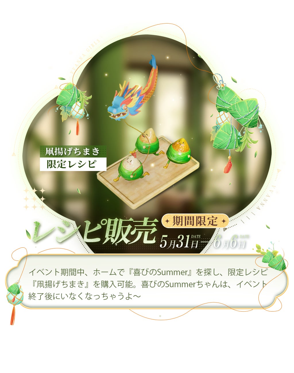 イベント期間中、ホームで喜びのSummerから限定レシピ『凧揚げちまき』を購入することができますよ!イベント終了後にSummerはいなくなってしまうので、お見逃しなく!