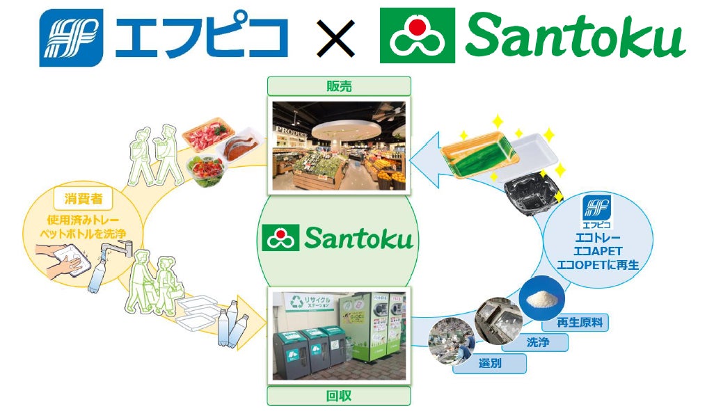 株式会社エフピコ(本社:東京都新宿区、代表取締役会長:佐藤 守正、以下「エフピコ」)は、株式会社三徳(本社:東京都新宿区、代表取締役社長:常木 貴良、以下「三徳」)と協働し、東京都23区を中心とした33店舗を対象に、三徳店頭にて回収された使用済み食品トレーおよびペットボトルをエフピコが資源化し、再び新たな食品トレー・容器に生まれ変わらせる「トレーtoトレー」「ボトルto透明容器」を行い、再び三徳店頭で積極的に「エコトレー」「エコAPET」「エコOPET」を使用する「ストアtoストア」の水平リサイクルを推進してまいります。