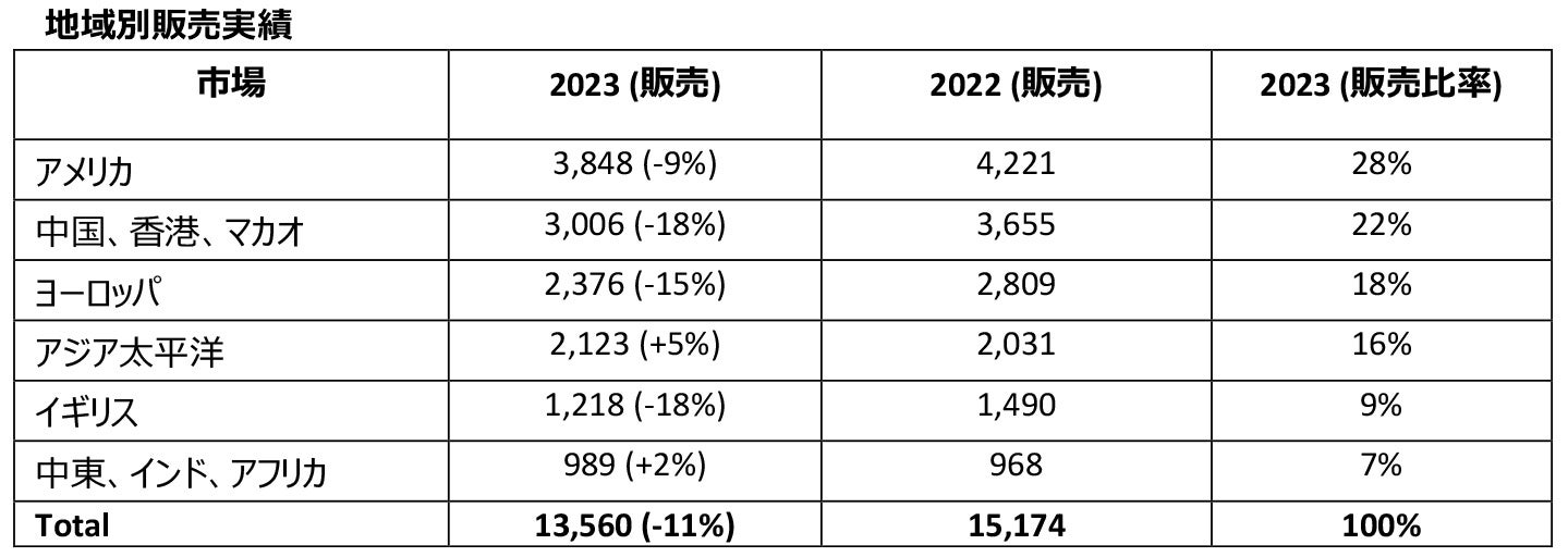 アズール、S、スピードといった高収益をもたらすデリバティブモデルへの顧客の関心も高まり、その構成比は2022年の30%から70%に達しました。また、ベンテイガEWBは、発売後最初の1年間で、同社のSUV受注の3分の1以上を占めるなど、予想を大きく上回りました。ベントレーのハイブリッド車ラインアップは引き続き人気を博しており、フライングスパーとベンテイガのお客様の4人に1人がハイブリッドオプションを選択し、英国が主要市場となっています。アジア太平洋地域(5%増)および中東、インド、アフリカ(2%増)ではプラス成長となったものの、中国や英国などの主要市場ではいずれも18%減となりました。