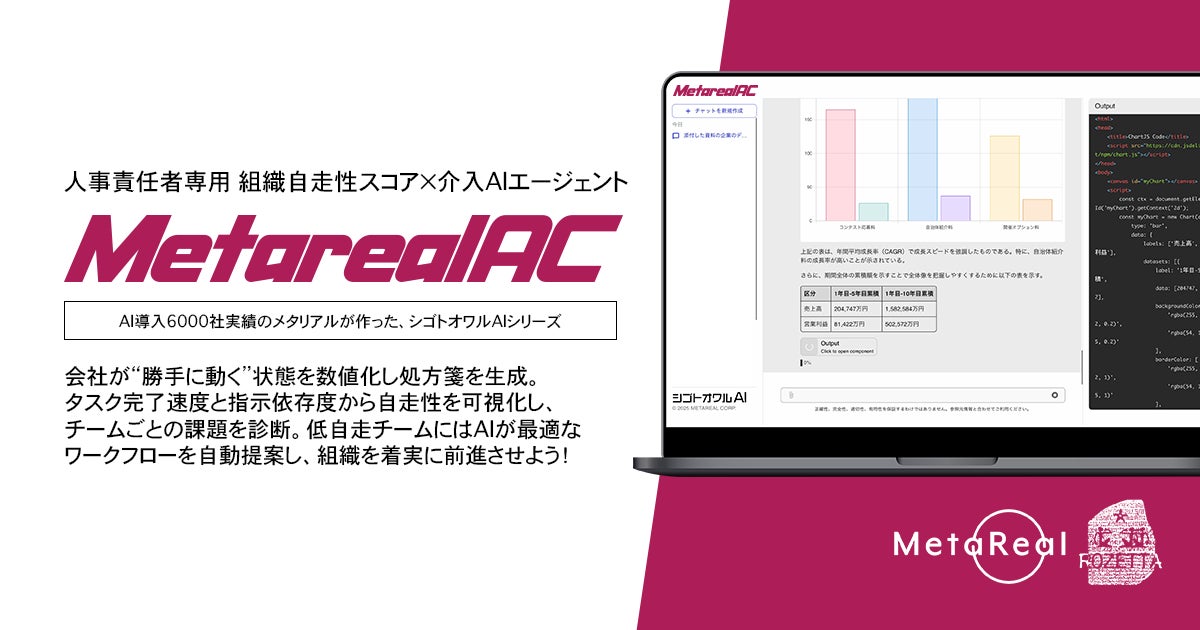 メタリアルグループの株式会社ロゼッタ(代表取締役:五石 順一)は、組織自走性スコア×介入AIエージェント「Metareal オートカルチャー」(以下、Metareal AC)を7月7日(月)に新開発・提供開始しました。また、CTO米倉のインタビューを掲載した広告をプレジデントオンラインにて7月7日(月)より公開いたしました。