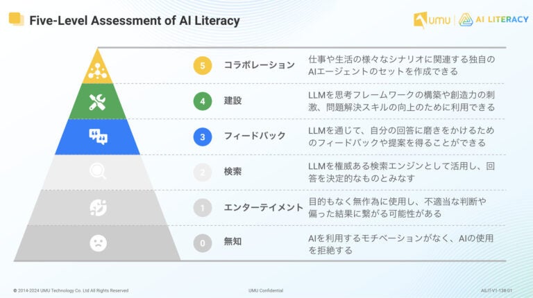 UMU(ユーム)は、2014年にシリコンバレーで誕生し、現在では世界203の国と地域で100万社以上、日本では28,000社以上に導入されているグローバルAIソリューションカンパニーです。AIを活用したオンライン学習プラットフォーム「UMU」を核に、学術的な根拠に基づいた実践型AIリテラシー学習プログラム「UMU AILIT(ユーム エーアイリット)」、プロンプト不要であらゆる業務を効率化する「UMU AI Tools」などの提供により、AI時代の企業や組織における学習文化の醸成とパフォーマンス向上を支援しています。従業員が自律的に学び、AIリテラシーを習得・活用することで業務を効率化し、より創造的で戦略的な仕事に集中できる時間や機会を創出。これにより、企業の人的資本の最大活用と加速度的な成長に貢献します。サービスサイト:https://umujapan.co.jp/