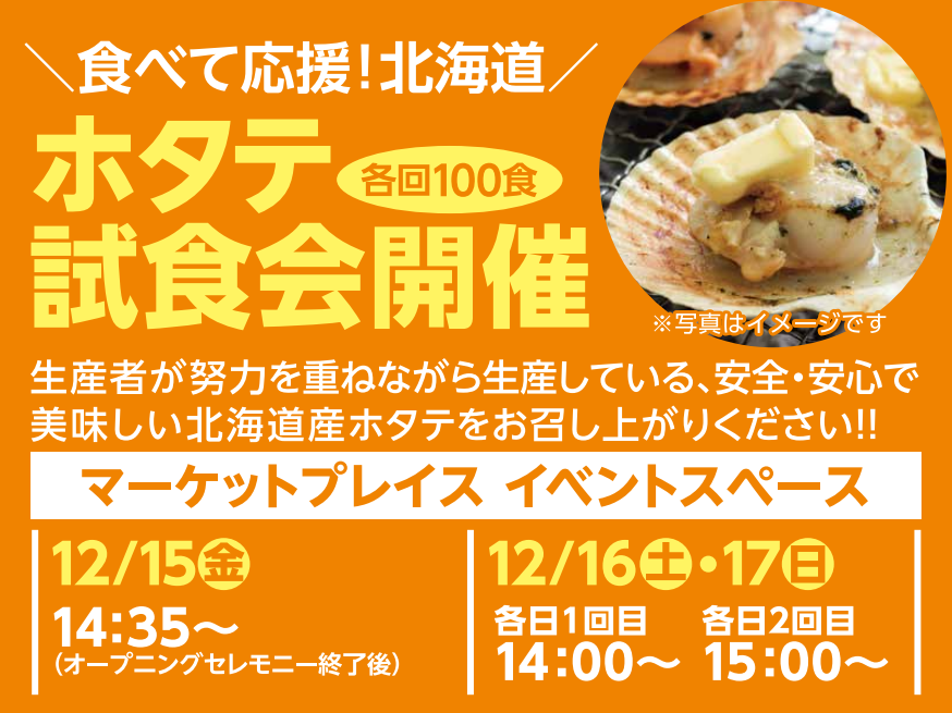 どさんこプラザでは、羽田産直館開業に合わせて「食べて応援!北海道」 年末企画を12/15(金)から開催します。どさんこプラザで3,000円以上お買い上げの方に、ホタテ関連商品をプレゼントします。