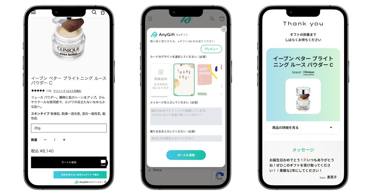 今回のAnyGiftの提供により、「クリニーク 公式オンラインショップ」にて人気の製品がeギフトとして贈れるようになります。