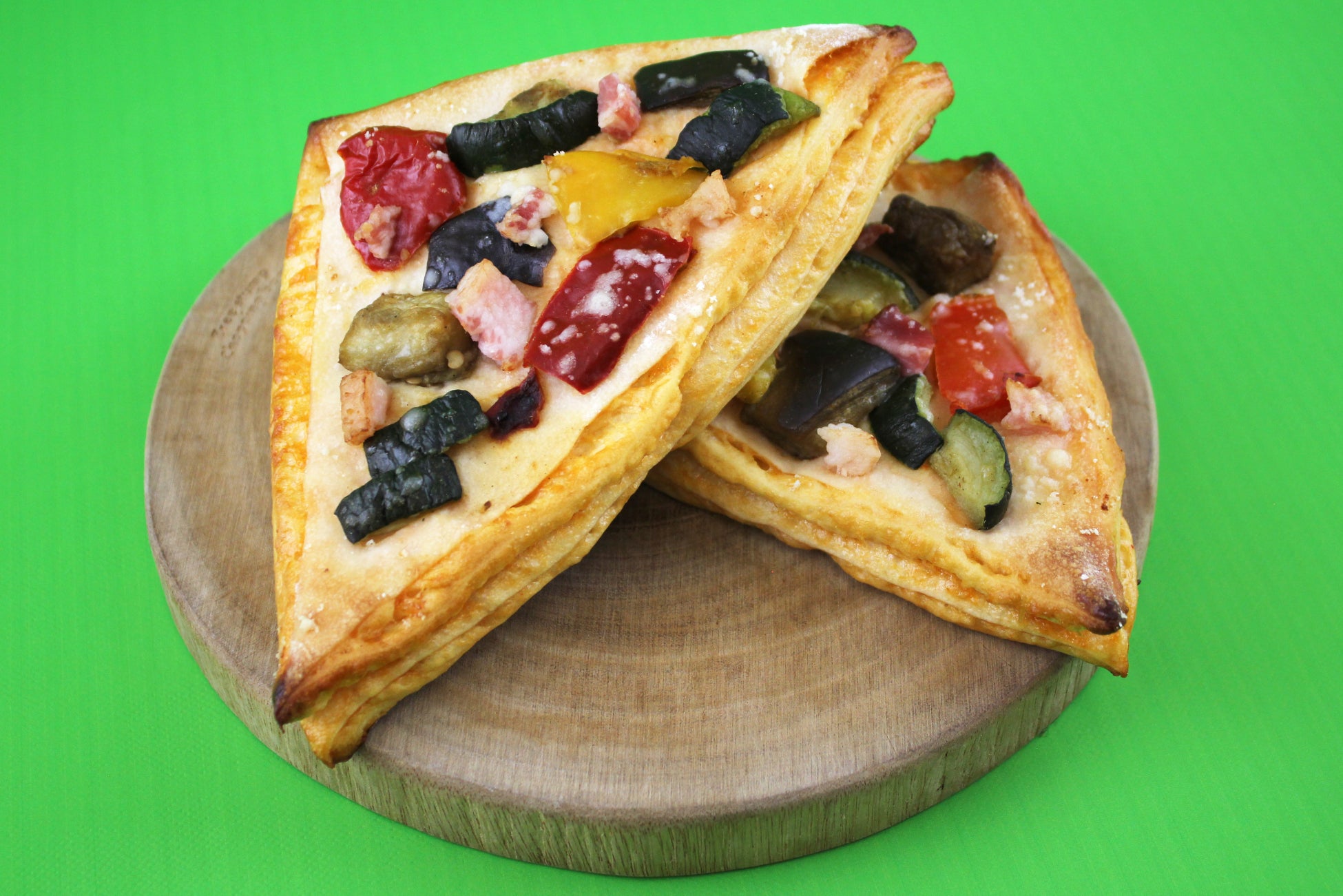 トマトとニンニクのフィリングを折り込んだ生地に、ハーブで味付けしたグリル野菜をトッピングして焼き上げました。グリル野菜のゴロっとした歯ごたえと、ニンニク香るピザ生地が食欲をそそる、ガッツリ食べたい時におすすめの一品です。
