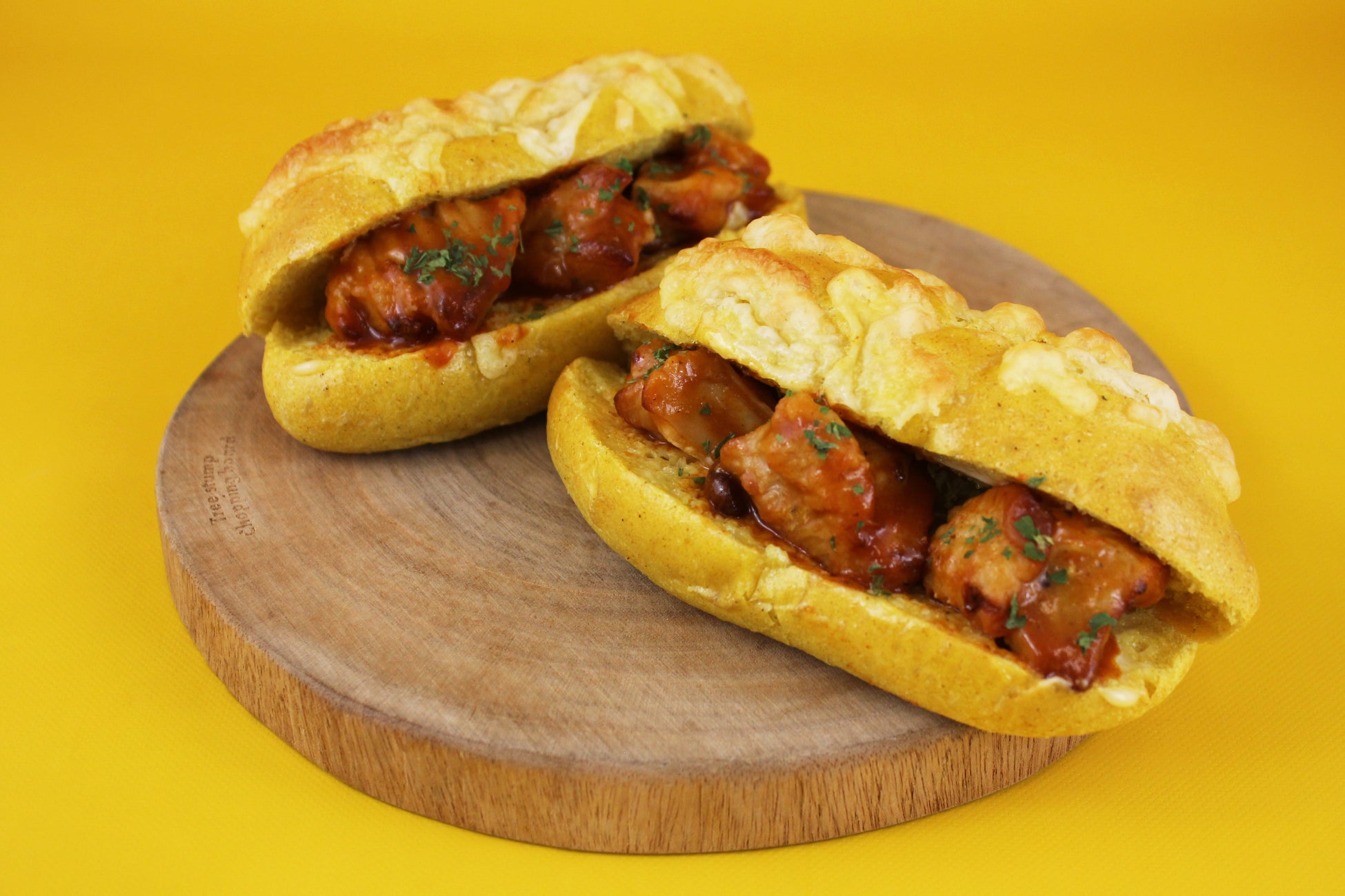 カレー粉を練り込んだ生地に、カレーケチャップを絡めたチキンをサンドしました。スパイシーなカレーと柔らかくジューシーなチキンは間違いなしの美味しさ。キンキンに冷えた飲み物との相性もバッチリです。