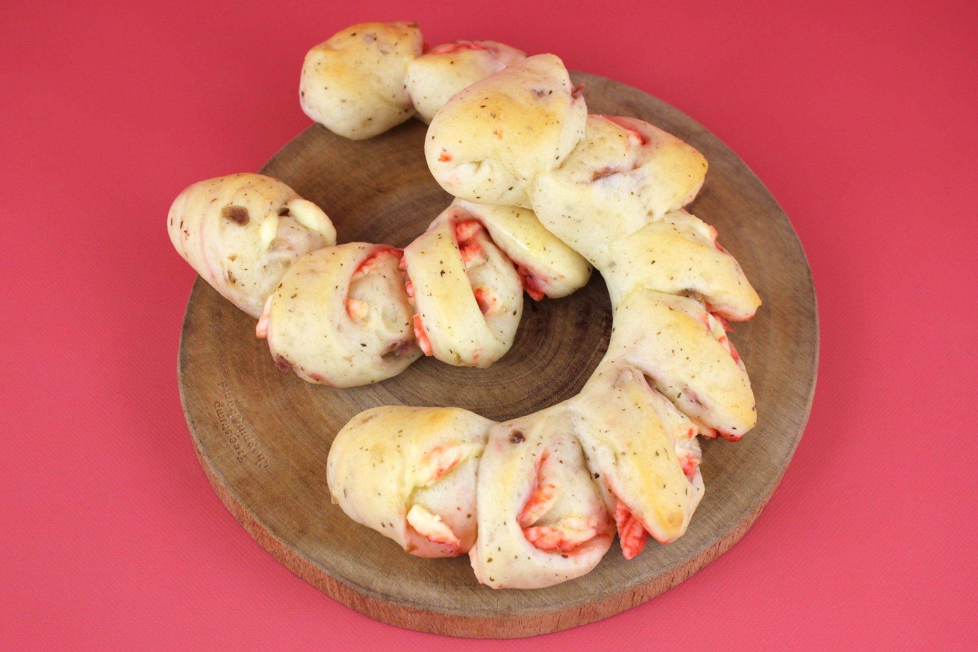 赤しそふりかけとカリカリ梅を練り込んだ生地に、梅肉とカマンベール風味のチーズクリームを包み焼き上げました。梅の酸味とチーズの濃厚さがお互いを引き立て合う、おつまみにもおすすめの一品です。