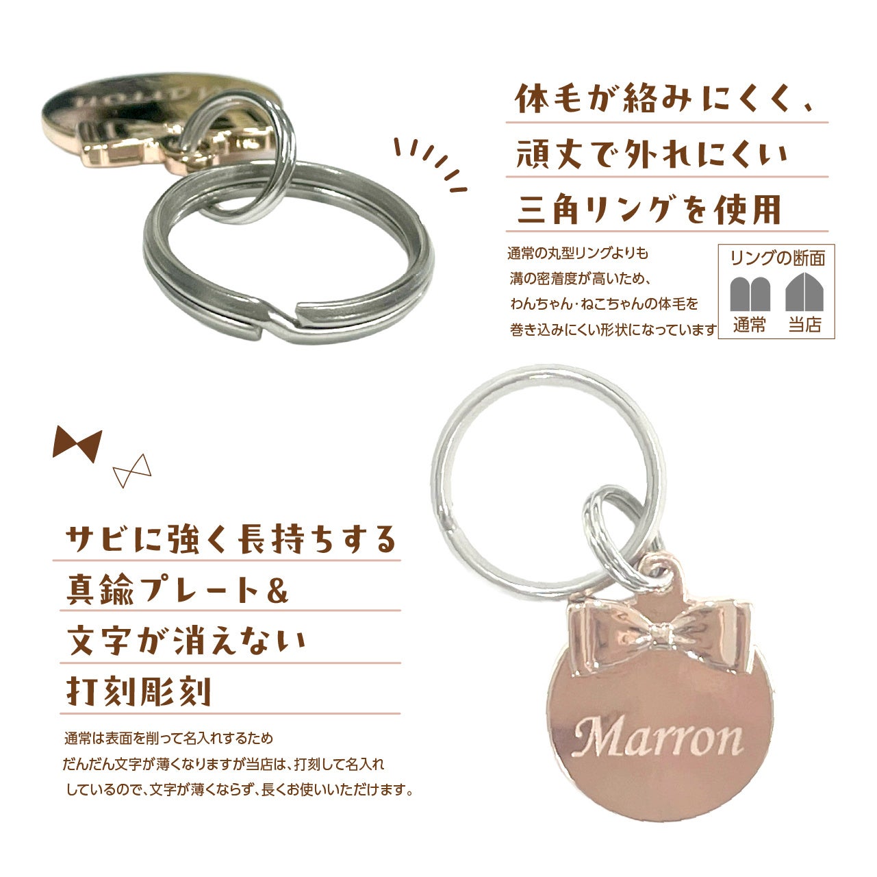 「リボン丸型迷子札」は、他にはないオリジナル形状で、うちの子の個性を引き立てながら、安心も叶えるアイテムです。