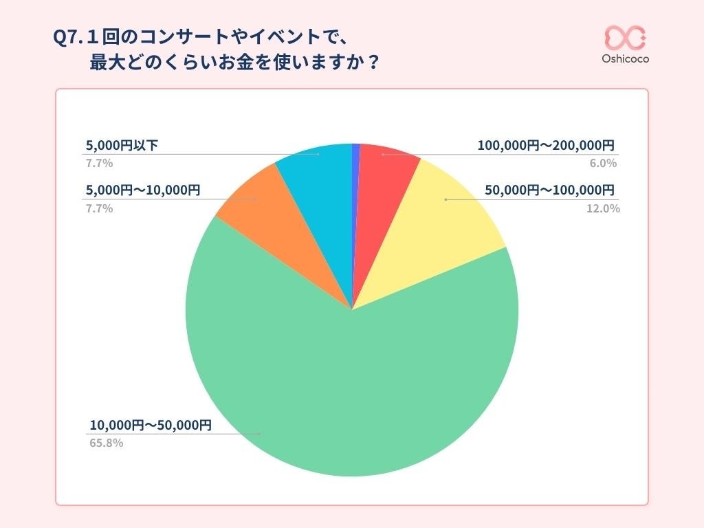 1回のコンサートやイベントで最大どのくらいお金を使うかを尋ねたところ、10,000円〜50,000円と回答した層が65.8%にのぼり、最も多数を占めました。