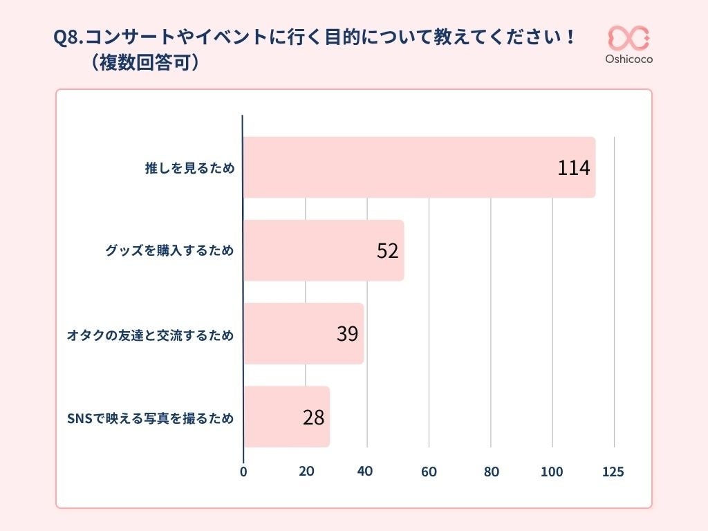 コンサートやイベントに行く目的については、「推しを見るため」が114票と断トツの1位となり、「グッズを購入するため(52票)」「オタクの友達と交流するため(39票)」「SNSで映える写真を撮るため(28票)」が続きました。