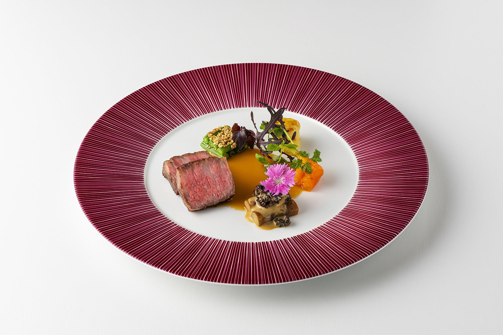 備長炭でじっくり焼いた博多和牛ロースを、シンプルなジューソースで仕上げた和牛の旨味を贅沢に味わえるメインディッシュです。白胡麻で合えたインゲン、モリーユ茸と牛蒡のフリカッセ、アプリコット風味の人参、根セロリのドゥフィノワなど、多彩な付け合わせで味わいの変化をお楽しみください。