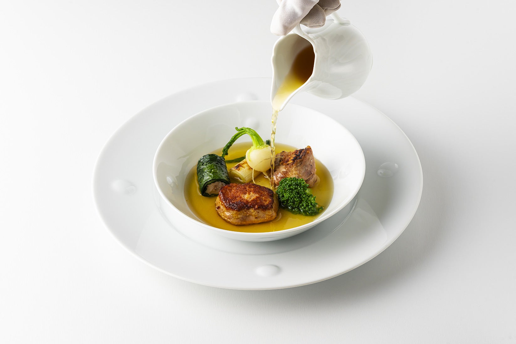 "フォアグラとコンソメ"という伝統的なフランス料理の組み合わせを、「はかた地どり」を煮出したコンソメで仕立てた贅沢な一皿。すっきりとした味わいのコンソメに、濃厚なフォアグラと炭火で焼いた鶏腿肉が調和した、まさに博多の「水炊き」を彷彿とさせる一品です。