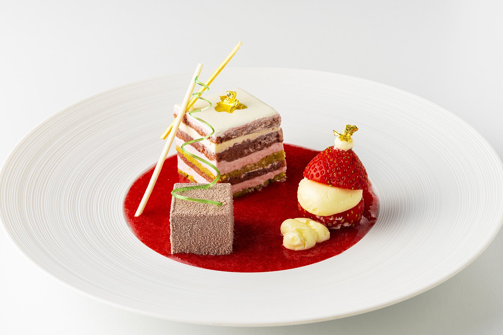 “いちごの王様”とも呼ばれる福岡名産「あまおう」を、ガナッシュやアンビべ、ピスタチオ風味のダックワーズなどでオペラ風に仕立てた、クリスマスにぴったりの愛らしいデザートです。オーム乳業の「九州マスカルポーネ」と香り豊かな紅茶のパルフェが、全体のバランスを整えつつ「あまおう」の上品な酸味や甘味を引き立てます。