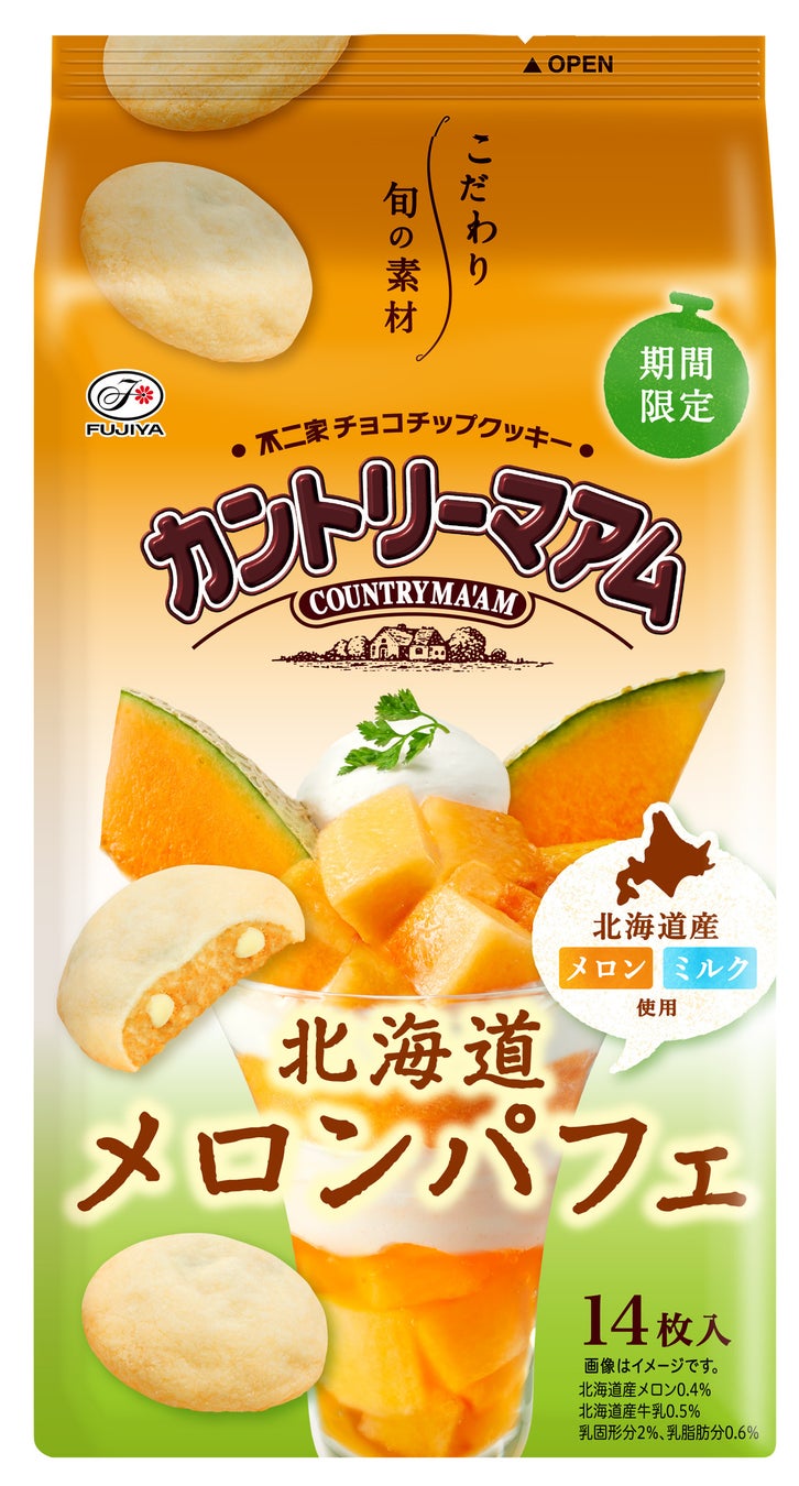 ・北海道産赤肉メロンのピューレと北海道産ミルクを練り込んだしっとりとした生地に、ホワイトチョコチップを組み合わせ、メロンパフェをイメージしたカントリーマアム