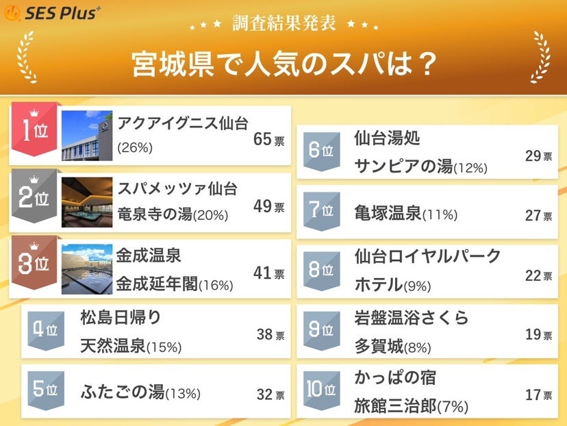 約250人の宮城県ファンに「宮城県で人気のスパは?」をアンケート調査したところ、1位「アクアイグニス仙台(65票)」、2位「スパメッツァ仙台 竜泉寺の湯(49票)」、3位「金成温泉 金成延年閣(41票)」という結果になりました。