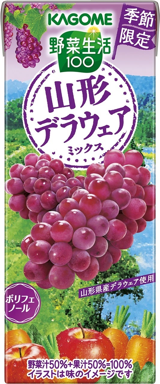 「野菜生活100 山形デラウェアミックス」は、寒暖差の大きい気候で育った、強い甘みと爽やかな酸味が特徴の山形県産デラウェアの味わいに仕上げた野菜&果実100%ジュースです。砂糖不使用で、ポリフェノールを摂ることができます。パッケージ背景には日本三大急流である最上川が流れる朝日町の風景をデザインしています。朝食のおともやリフレッシュしたいときにおすすめです。