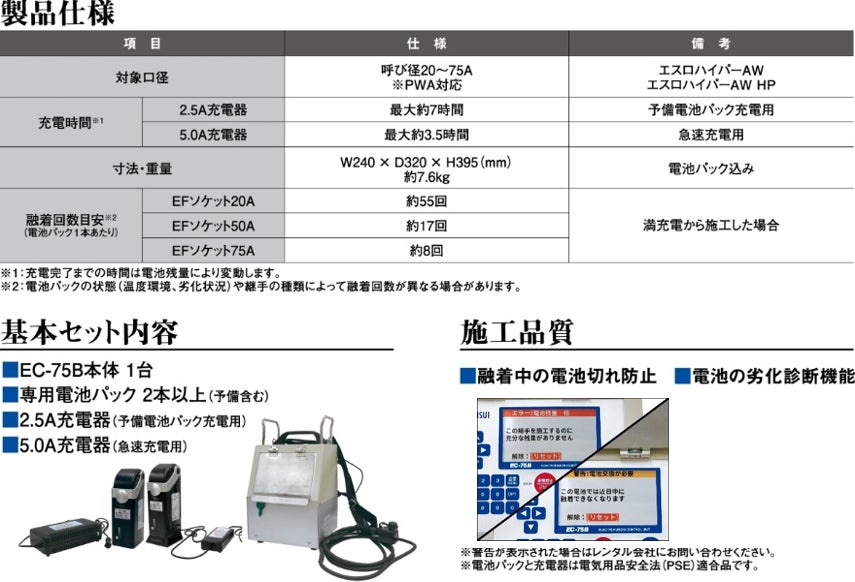 『エスロハイパーAW』電池パック駆動型EF融着機『EC-75B』新登場