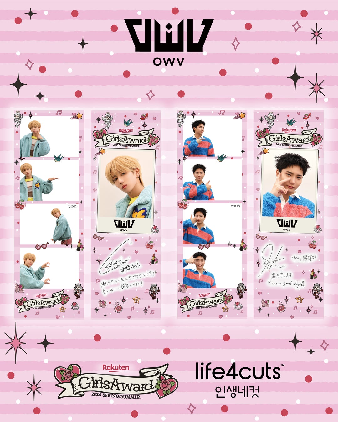 株式会社DONGRAMY PROJECT(本社:福岡県北九州市)が運営する韓国発のセルフフォトプリント「人生4カット」は、2026年4月18日(土)に代々木第一体育館にて開催される日本最大級のファッション&音楽イベント「Rakuten GirlsAward 2026 SPRING/SUMMER」に出演する、株式会社NTTドコモ・スタジオ&ライブ所属の4人組ダンスボーカルグループ・OWV(オウブ)」のメンバー浦野秀太さん・中川勝就さんとのトリプルコラボレーションによる、限定オリジナルフレームの展開を決定いたしました。