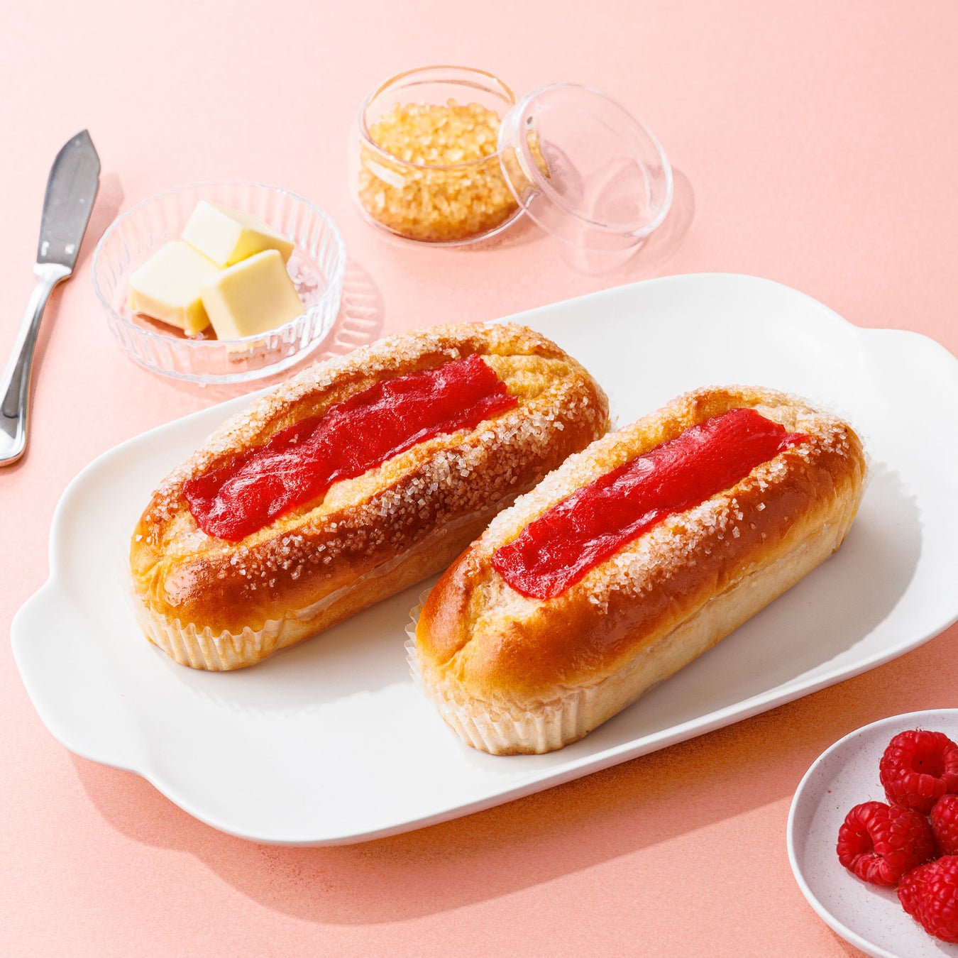 ラズベリーパウダー入りの淡いピンク色の酒種入り菓子パン生地に、バターとザラメをトッピングして焼き上げました。仕上げにラズベリージャムを絞った、甘酸っぱさを楽しめる夏にぴったりのシュガーバターです。