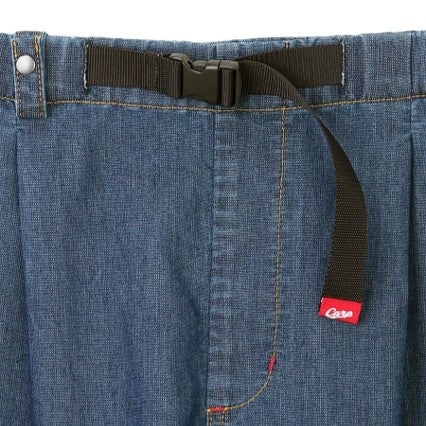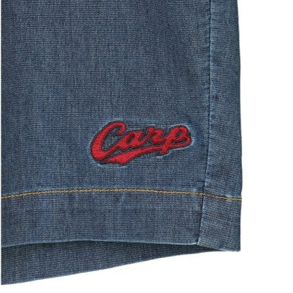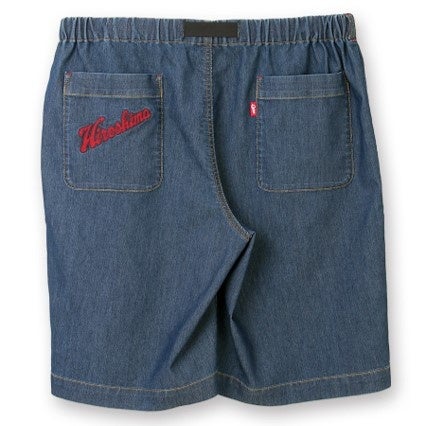 第2弾となるデニムショートパンツは、夏場の長時間の応援を想定し、軽量ストレッチ性に加え、通気性と吸汗速乾性にも優れたドライタッチデニムを採用しています。ウエストサイズを調整できるバックル付きナイロンベルト仕様で、ベルトの先にはカープロゴ入りネーム付きです。また、左足裾の前脇側にCarpロゴを、左後ろポケットにはHiroshimaのロゴを最新の濃い赤に紺の縁取りバージョンで刺繍。シルエットは、膝上丈設定(股下25㎝)でヒップ・ワタリ幅も程よく細身なスッキリとしたデザインとなっています。さらに、プロ野球の応援では必需品となっているカンフーバットを下げられるループ&タブ付きとなっており、暑さにも負けず熱い応援を繰り広げられる応援用デニムショートパンツとなっています。