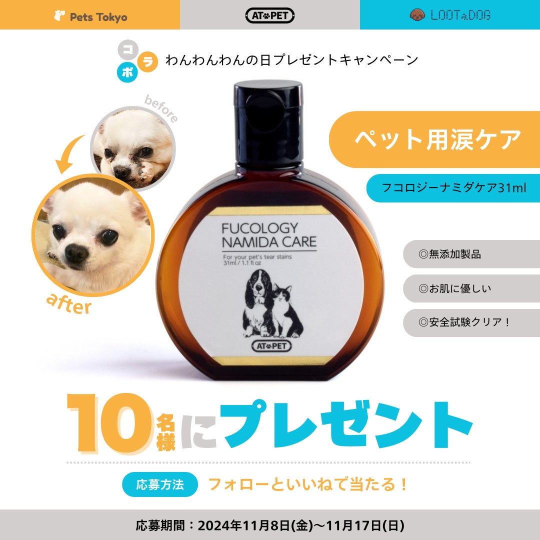 ラムズマークス株式会社提供の“お肌の弱いペットのため”の涙やけ除去剤「フコロジーナミダケア 31ml」が当たるコラボキャンペーンです。
