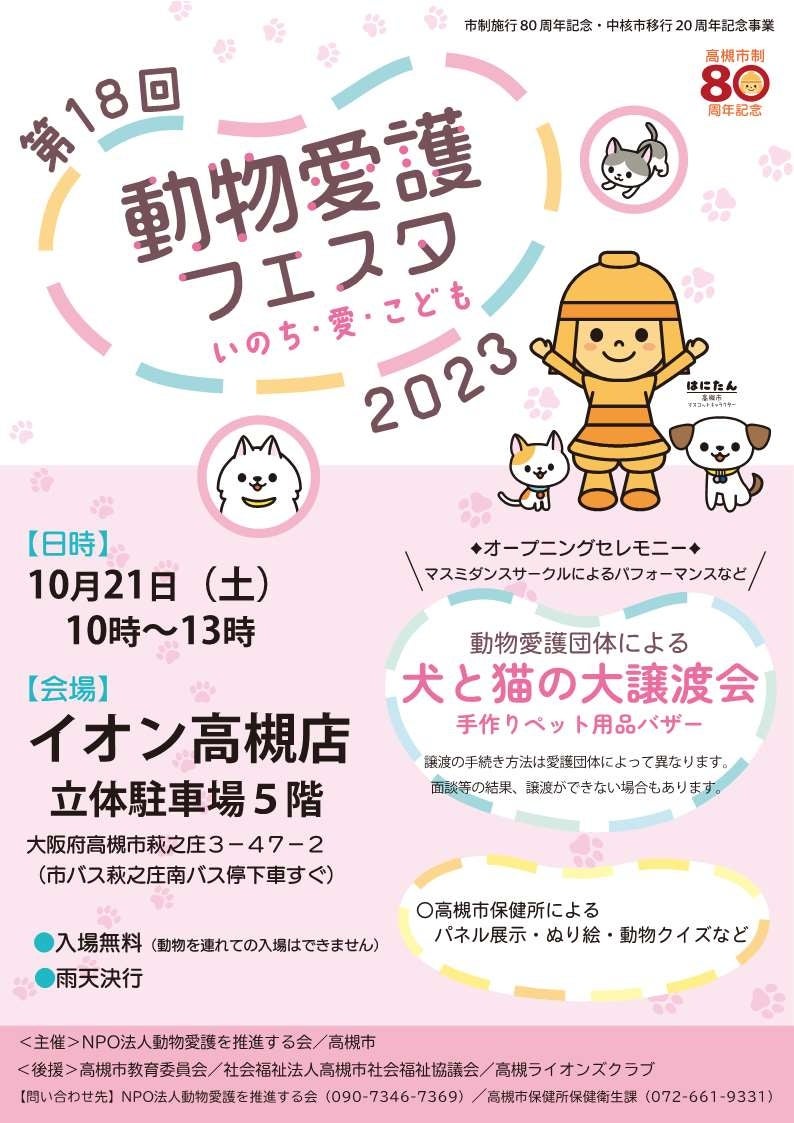 高槻市とNPO法人動物愛護を推進する会は、令和5年10月21日(土曜日)、イオン高槻店で動物愛護フェスタを開催。動物愛護団体で保護している犬と猫の譲渡会を行うとともにパネル展示などを実施し、動物の命の大切さを伝えます。