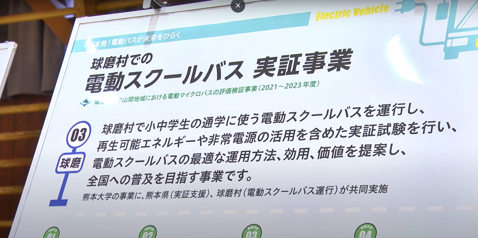 脱炭素化、エネルギー地産地消、強靭化、過疎地交通などの地域課題の解決と、導入が遅れている電動マイクロバスの普及を目的として、熊本大学が環境省事業を受託して、国の脱炭素先行地域に指定され令和2年豪雨災害からの復興を進める熊本県球磨村で行った全国初の電動スクールバスの実証プロジェクト。