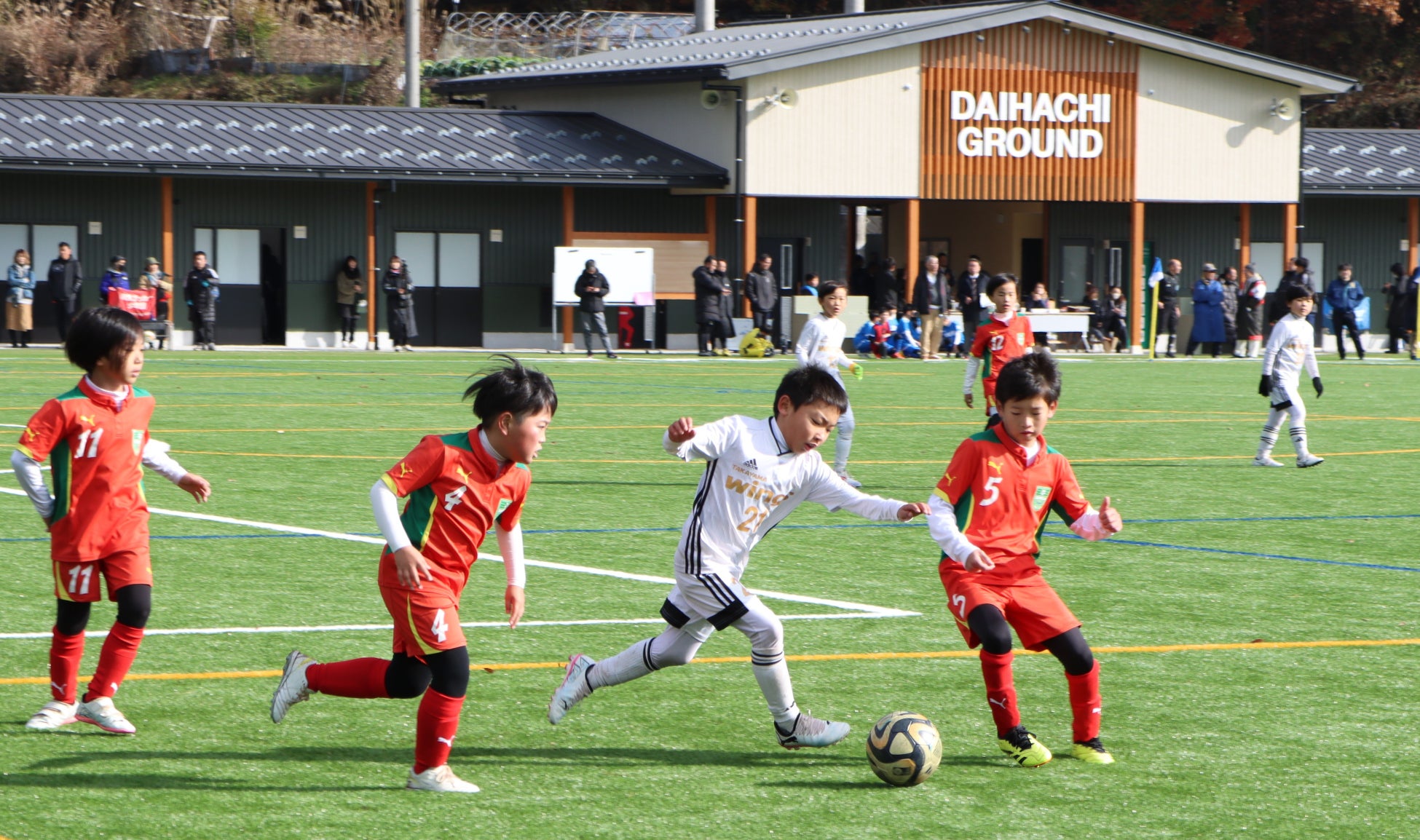 岐阜県高山市では、市内初の人工芝を使った「大八グラウンドサッカー場」が完成し、令和6年11月24日(日)に開催したオープニングセレモニーには、関係者や地元の子どもたちおよそ300人が出席しました。