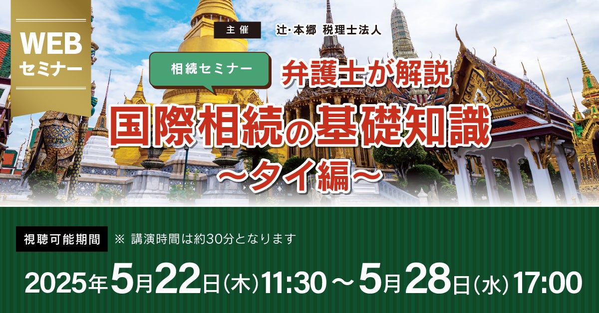 辻・本郷 税理士法人(本社:東京都新宿区、理事長:桑木小恵子)は、2025年5月22日(木)より「【相続セミナー】弁護士が解説 国際相続の基礎知識~タイ編~」セミナーを開催いたします。