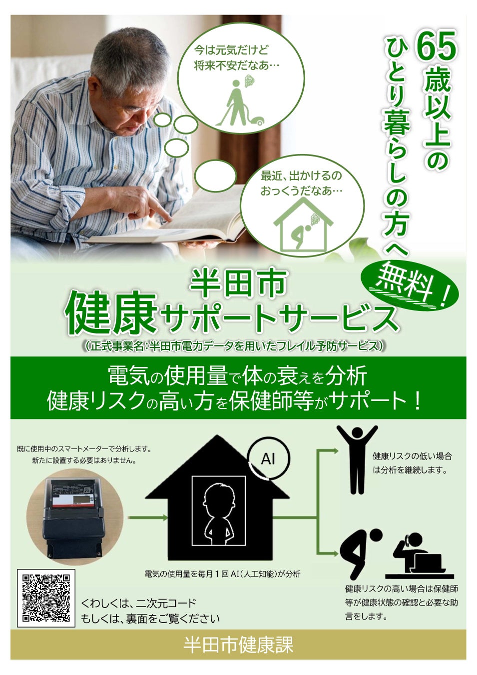 電気の使用量からAI(人工知能)によって体の衰えを毎月分析し、健康リスクが高い場合は、保健師等が健康状態の確認と必要な助言を行うサービスです。体の衰えに早く気づき対応することで健康状態の回復が期待できます。