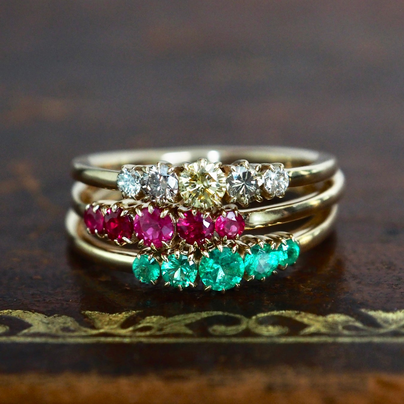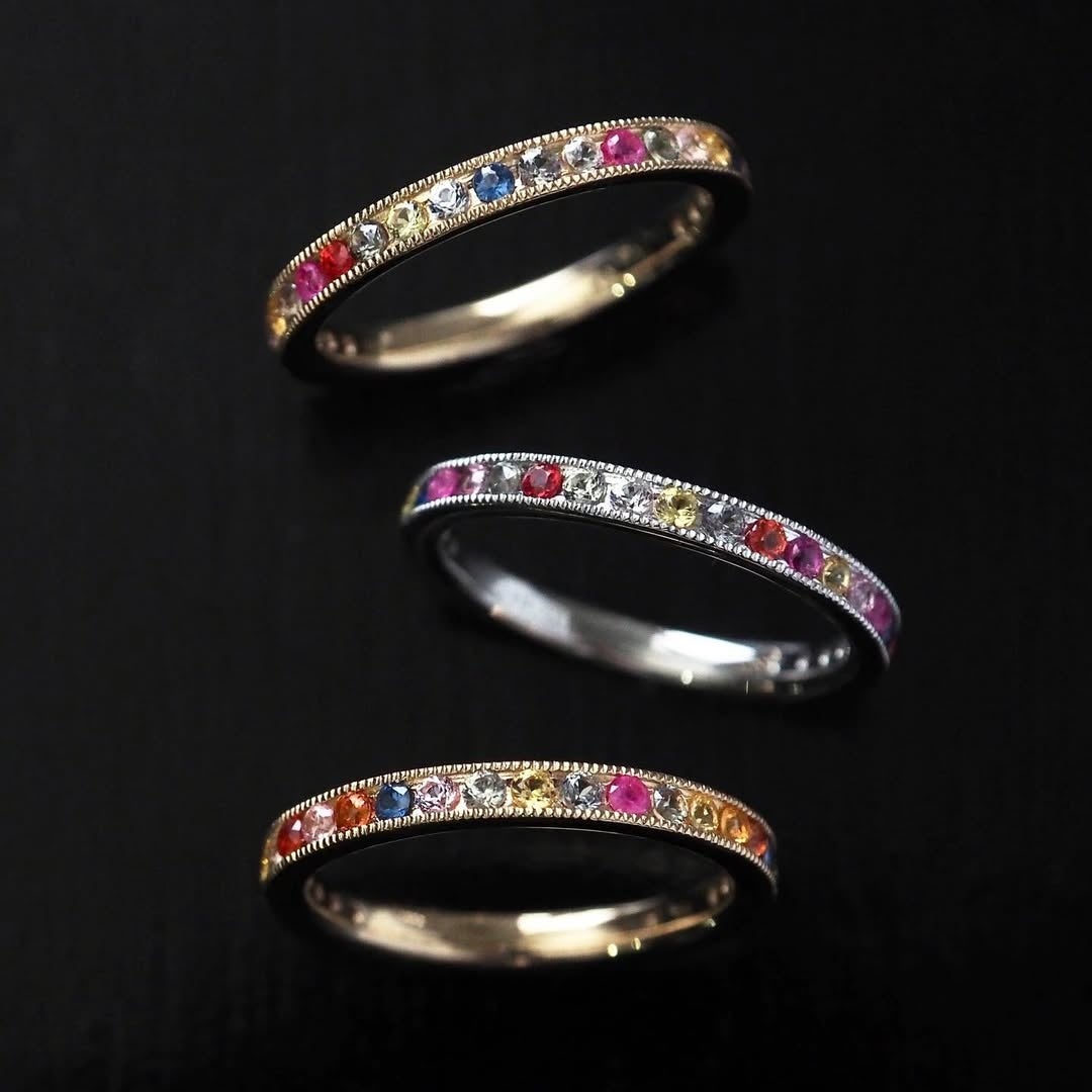 葉が巡るような有機的なラインに、ダイヤモンドやカラーストーンをバランスよく配したフルエタニティデザイン。360度どこから見ても異なる表情が楽しめる、遊び心と上質さを兼ね備えた仕立てです。