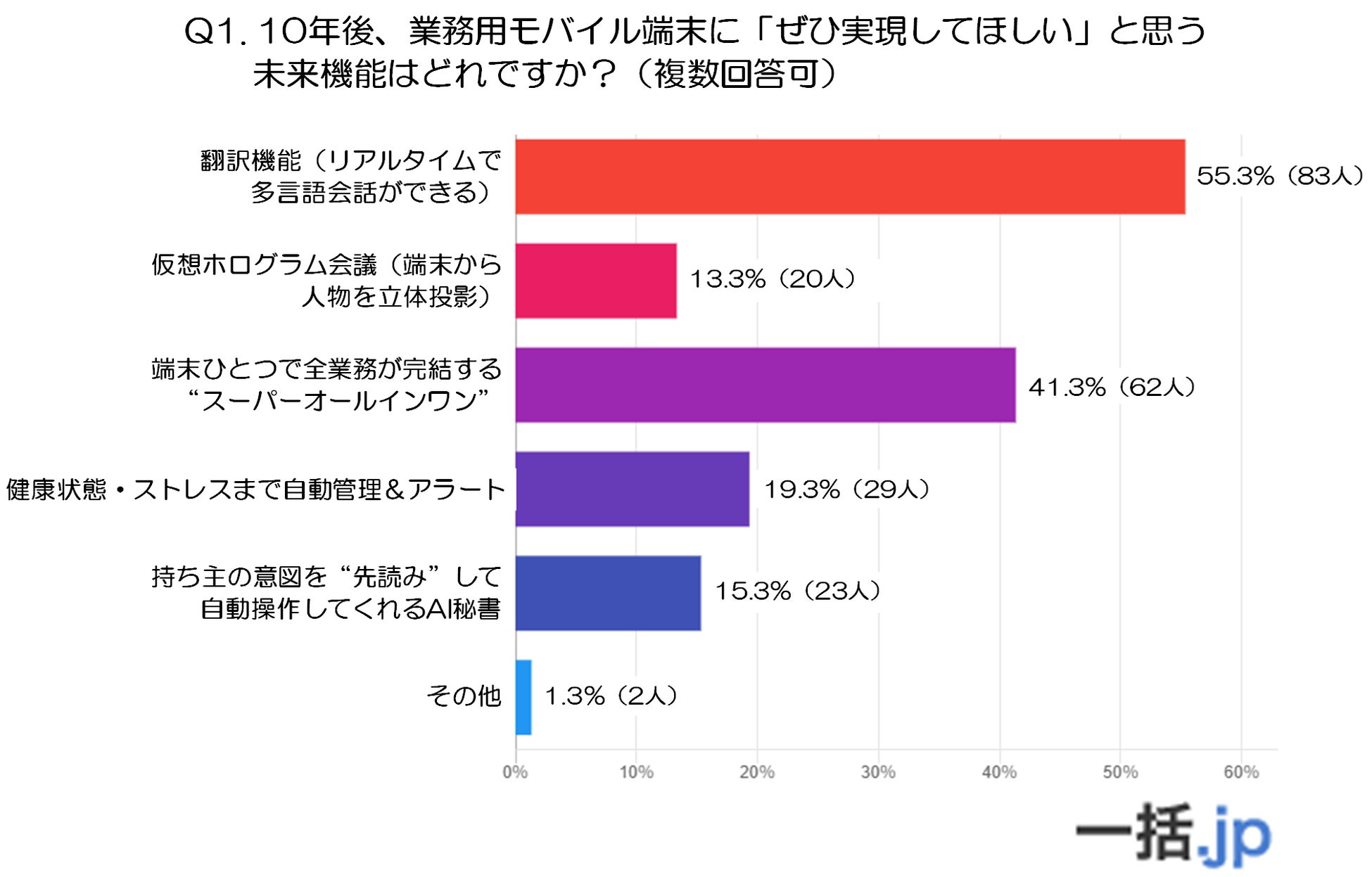 最も多くの人が期待しているのは「翻訳機能(リアルタイムで多言語会話ができる)」で、全体の55.3%(83人)が支持しています。
