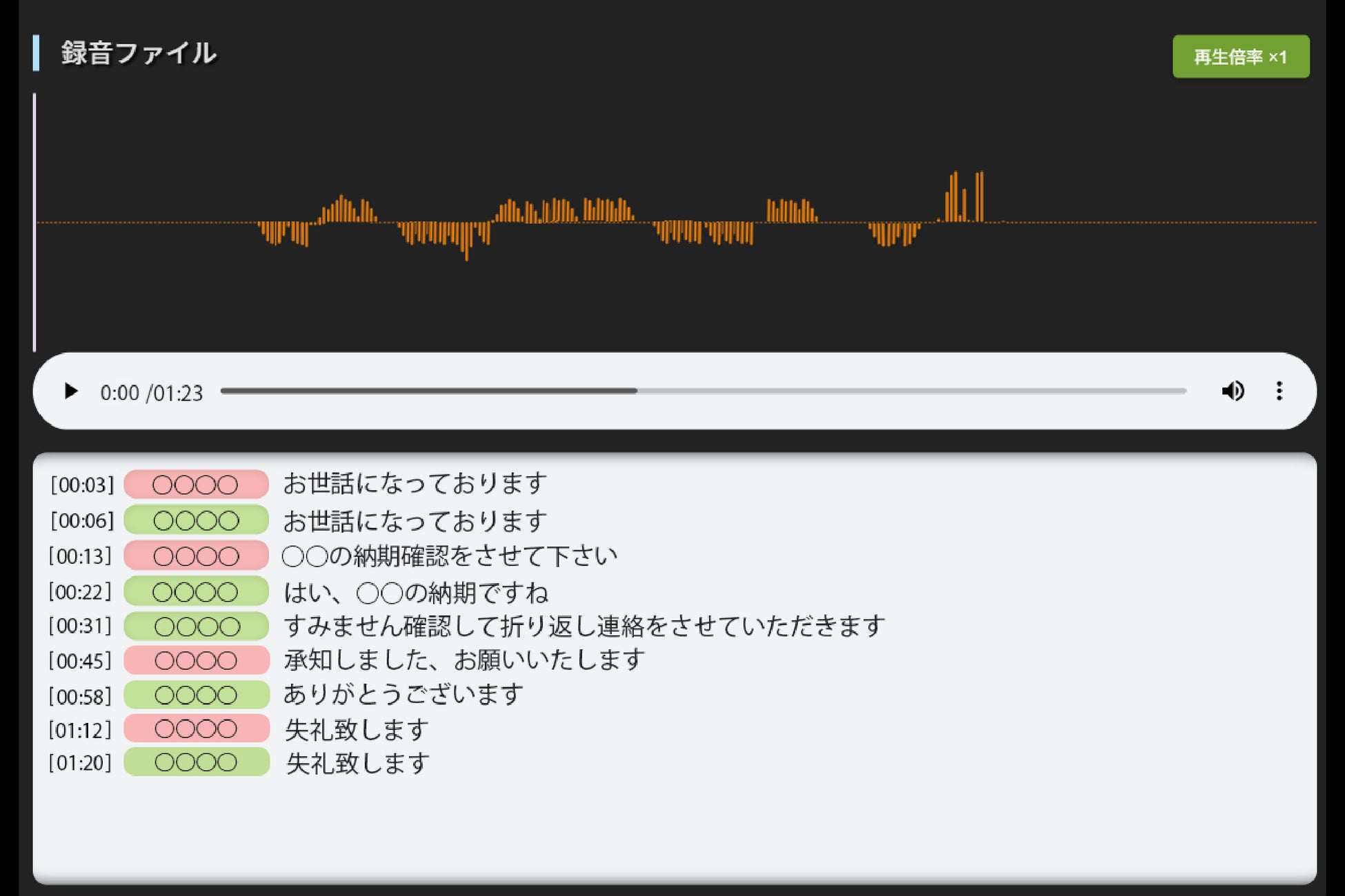 通話内容を文字情報として蓄積できるため確認・検索・共有が容易で、業務の効率化や情報共有の精度向上に貢献します。テキスト化された通話内容は日時・回線・着信先・発信元などの各種情報以外に加え、キーワードでも検索可能です。また、辞書機能に固有名詞を事前登録することで誤変換の防止も行えます。
