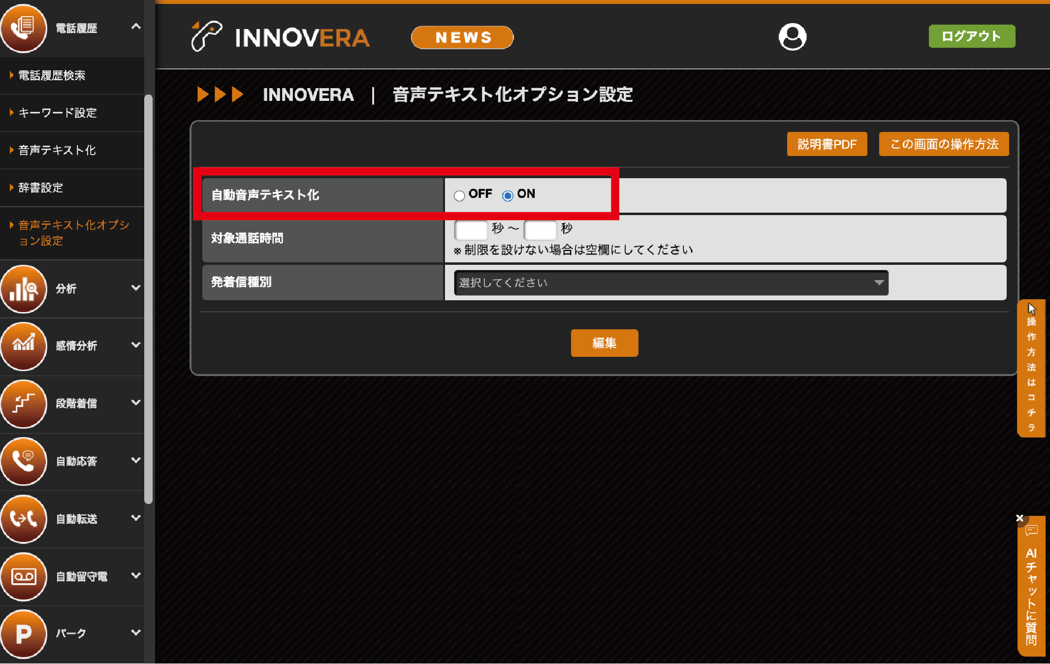 音声テキスト化オプション設定で「自動音声テキスト化」をONにし、条件を設定すると、通話終了時に条件に該当する通話内容が自動的に文字起こしされます。