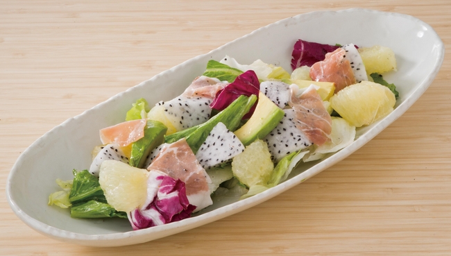 新鮮でシャリシャリとした独特の食感をそのままお楽しみいただける「ドラゴンフルーツプレーン」から、グレープフルーツ・アボカドと一緒にお楽しみ頂ける「ヘルシーフルーツサラダ」、2つの相性がぴったりの「ドラゴンフルーツ生ハムのせ」等、NIJYU-MARUでしか食べることができないオリジナルのトロピカルメニューをご用意しております。遊び心溢れた夏のお料理を、是非この機会にお楽しみください。