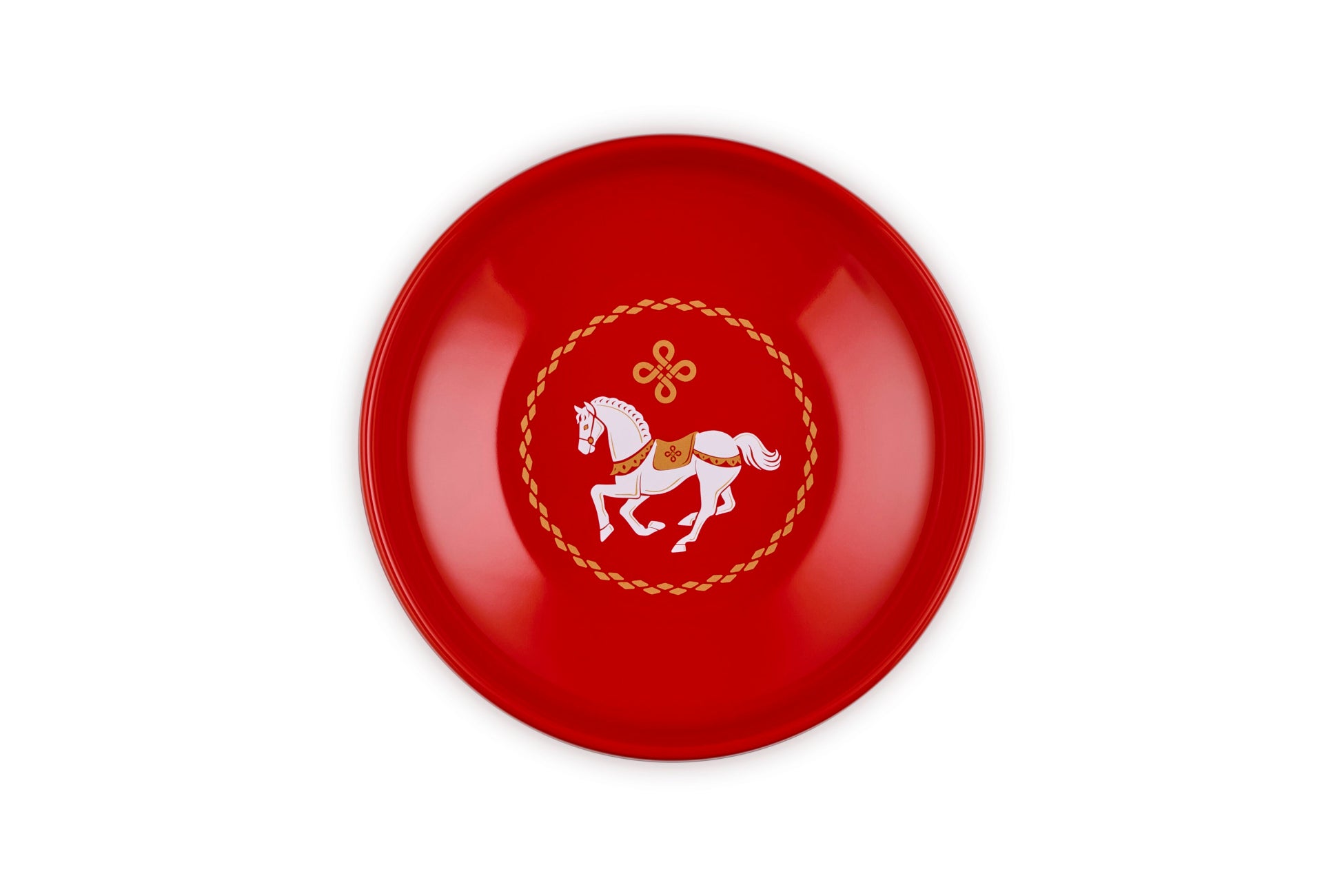 程よい深さがあって使いやすい「レジェ・ラウンド・ディッシュ」に、美しいイラストをあしらった特別なデザインが登場。ディッシュの中央には干支の午とカルーセルを掛け合わせたモチーフが描かれ、新年を祝福します。シンプルなデザインは、和洋を問わず、どんなお料理も引き立てます。日常使いはもちろん、同コレクションのプレートとそろえて特別な日の食卓を演出するのもおすすめです。
