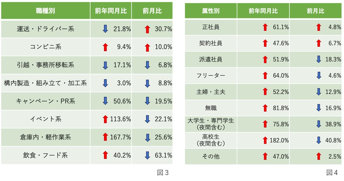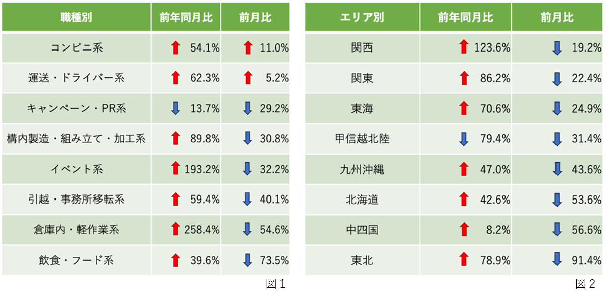 前年同月比で最も増加率が大きかったのは「倉庫内・軽作業系」で、+167.7%となっており、ついで「イベント系」、「飲食・フード系」となっています。前月比で最も増加率が大きかったのは「運送・ドライバー系」で、+30.7%となっており、ついで「コンビニ系」となっています。