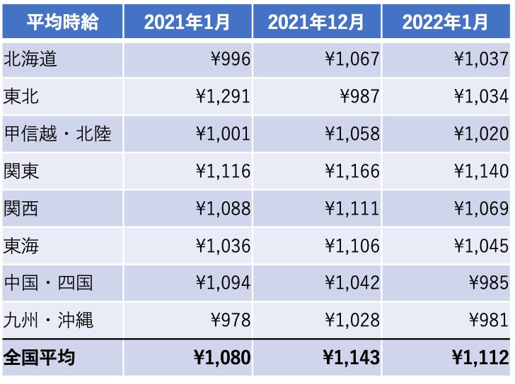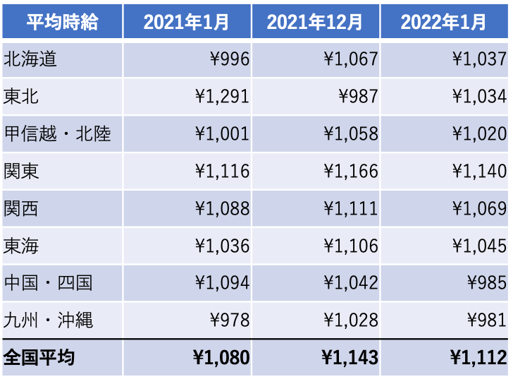 前年同月比で最も増加しているエリアは北海道、前月比で最も増加しているエリアは東北となっています。繁忙期の12月は応募獲得に向け、時給が高くなる傾向にありますが、1月は繁忙期を終え、少し落ち着いたことが考えられます。(2022年1月現在)