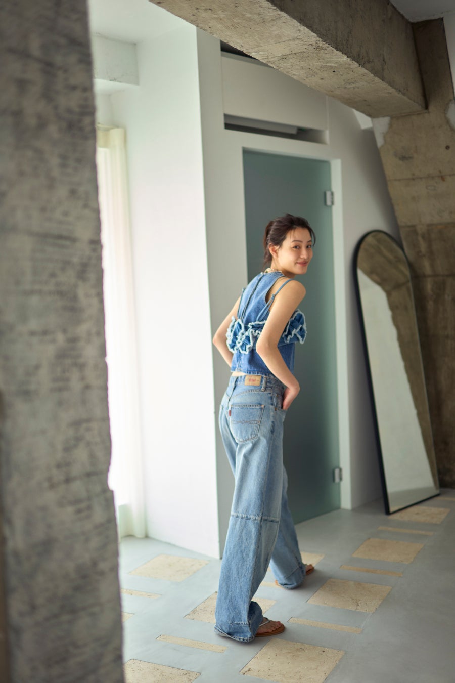 潔さが際立つカジュアルスタイルから、女性らしさを感じさせるヘルシームードまで、花山瑞貴さんが纏いながら、多彩なデニムの魅力を表現しています。
