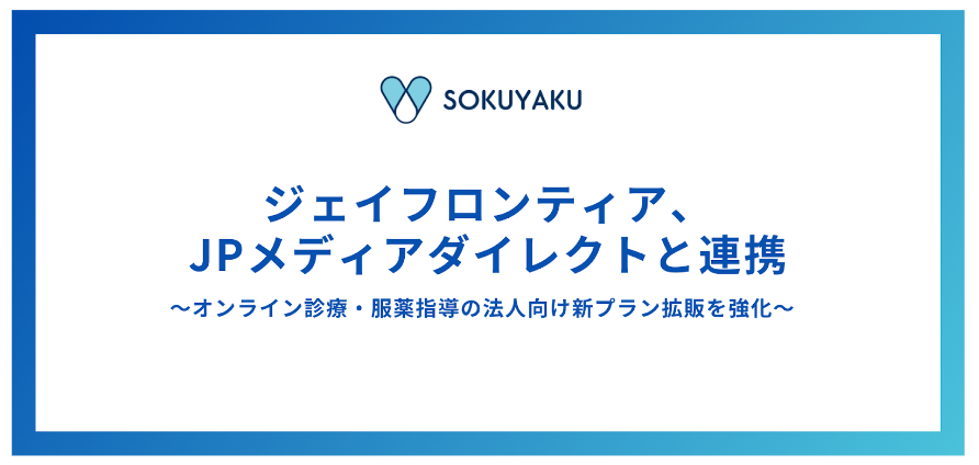 ジェイフロンティア株式会社(本社:東京都渋谷区、代表取締役社長執行役員:中村篤弘、以下「ジェイフロンティア」)は、日本郵政グループの株式会社JPメディアダイレクト(本社:東京都港区、代表取締役CEO:佐野公紀、以下「JPMD」)と、ジェイフロンティアが提供するオンライン診療・服薬指導サービス「SOKUYAKU(ソクヤク)」にて、今後提供を予定している法人向け新プランの拡販において連携を開始することをお知らせいたします。
