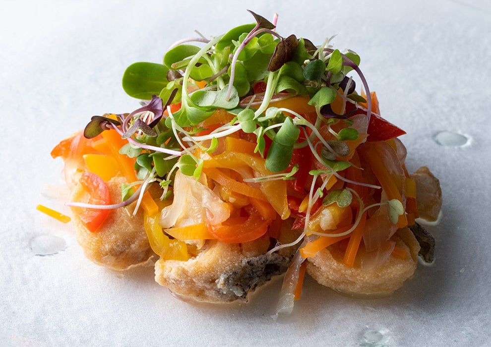 揚げた天然真鯛と、パプリカ、玉ねぎ、にんじん、セロリをホワイトビネガーなどで和えた、すっきりとした酸味をもつ夏の人気オードブルです。