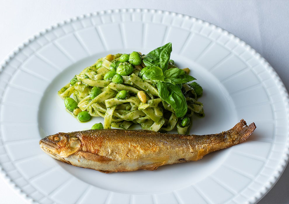 - 鮎のコンフィと枝豆のペスト・ジェノベーゼのタリアテッレ https://www.umai-mon.com/user/collection/1701