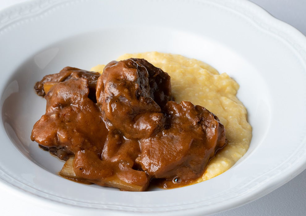 贅沢にも米沢牛のランイチを使っています。酸味のあるサンジョベーゼ系の赤ワインで2時間ほど煮込んであります。新ゴボウが、食感と旨みのいいアクセントです。付け合わせは、とうもろこしの粉をバターなどで練ったポレンタです。