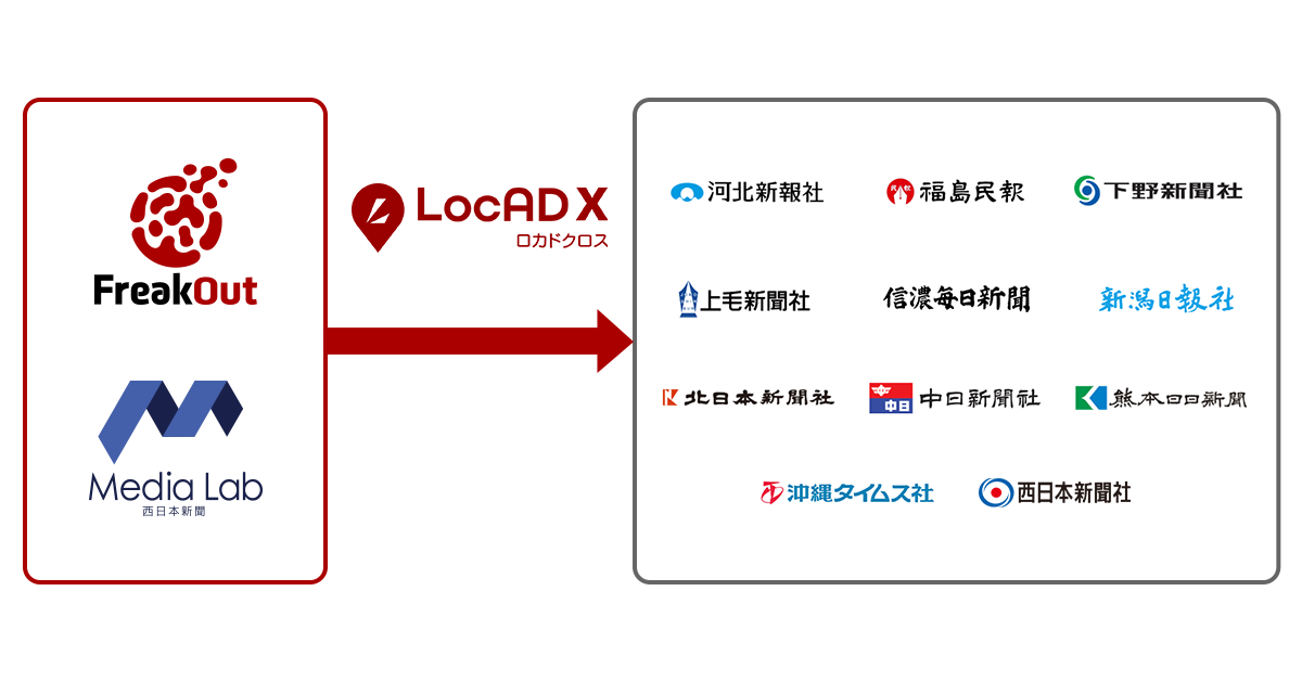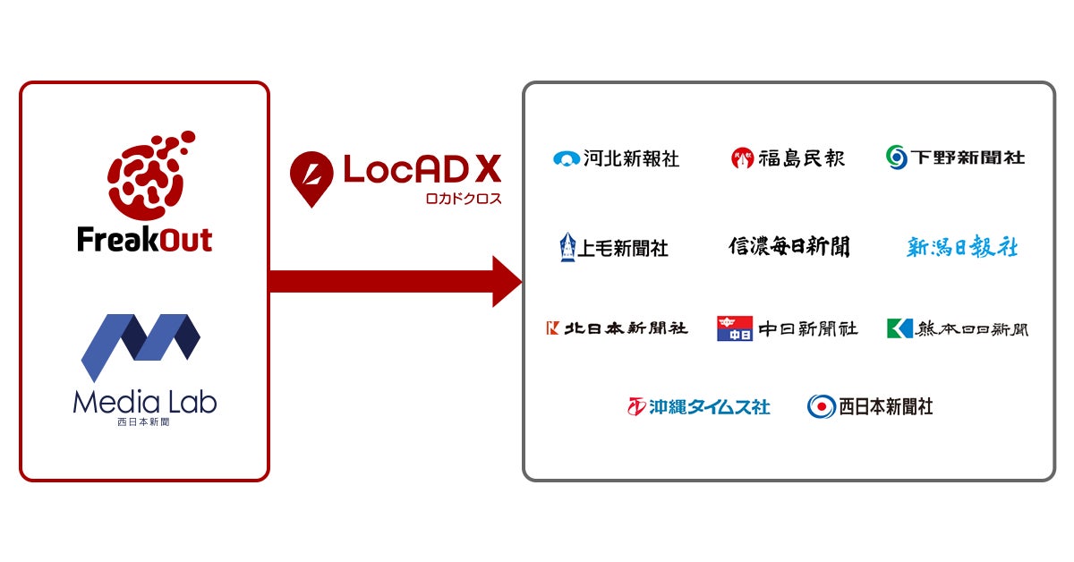 具体的には、フリークアウトが持つ位置情報データ・広告配信の技術を、西日本新聞メディアラボが提供する位置情報広告サービス「LocAD X」(ロカドクロス)に実装し、精緻な地点ターゲティングやGPSを活用した来店計測など大幅な機能アップデートを実施します。西日本新聞メディアラボが持つ総合的な広告提案力と、全国地方新聞社ネットワークを活用し、地域経済の活性化と、小売・有店舗事業者・行政機関のデジタルトランスフォーメーション(DX)を強力に推進します。