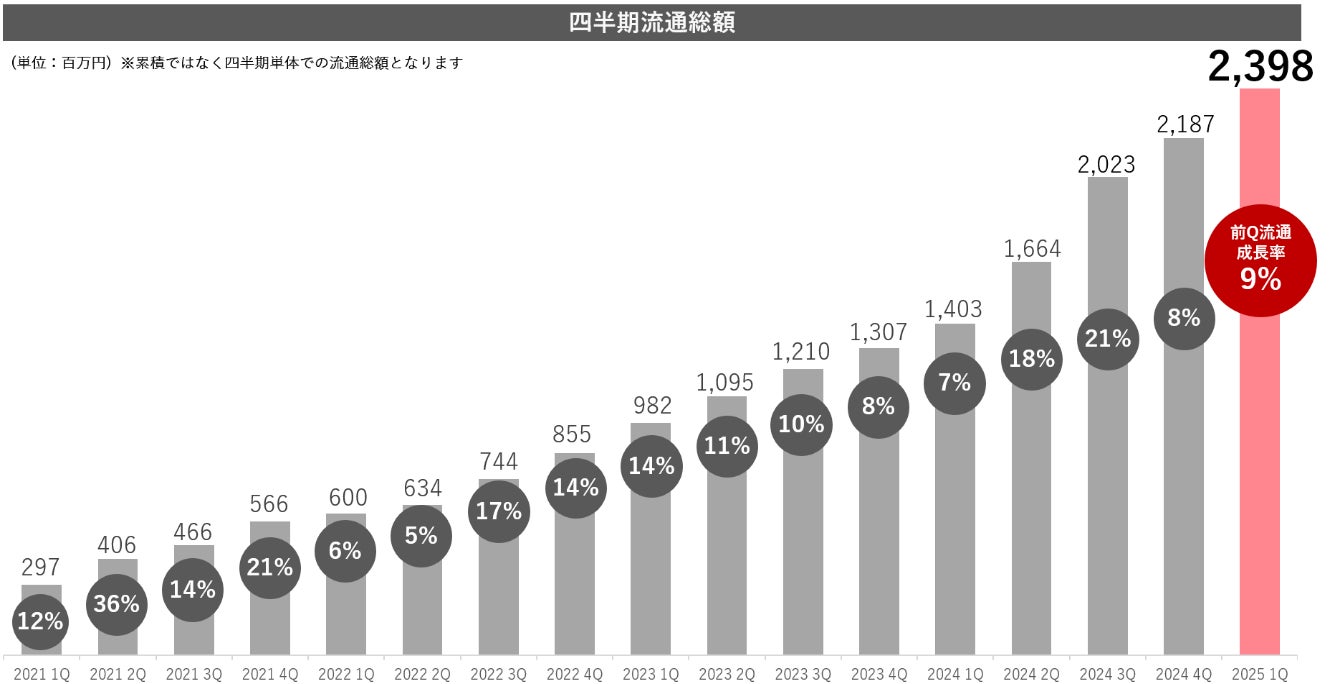 当社は、2027年9月期流通総額1,000億円の目標(※)に向けて、資金移動業の取得、デジタル給与払いの取得に向けた動きなど、サービスとしての品質向上、また、カスタマーサクセスによるクライアント満足度向上及び営業活動の強化を推進しております。結果として、2025年9月期第1四半期において流通総額が23.5億円を突破、19四半期連続成長を実現いたしました。