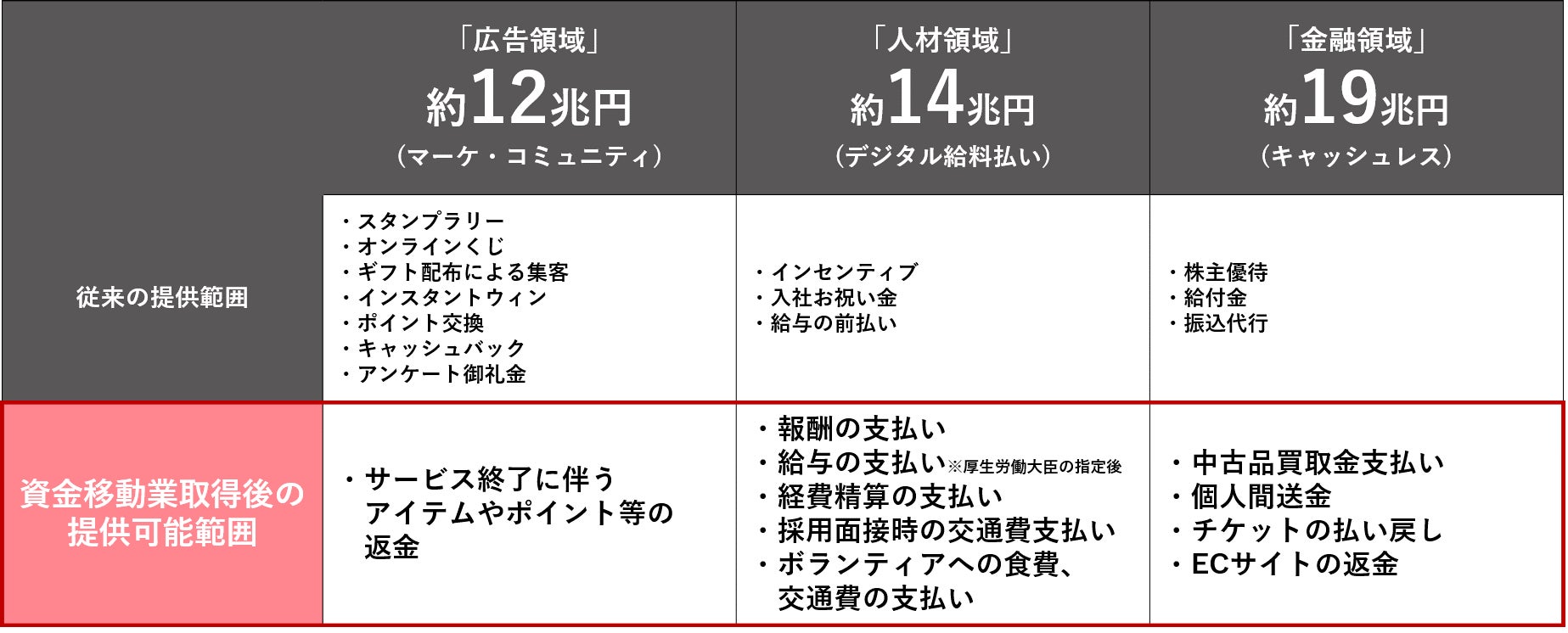 マーケティング(広告)領域・人材領域・支払いのDX(金融)領域の3つの領域を注力領域としてあげ、3万円以下のtoC向け支払いでのシェア拡大を目指し邁進しております。