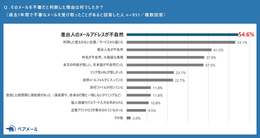 また、そのメールを不審だと判断した理由について尋ねたところ、「差出人のメールアドレスが不自然」(54.6%)、「利用した覚えのない企業/サービスから届いた」(53.1%)、「差出人名が不自然」(41.5%)が上位に挙がりました。ユーザは主に「差出人のアドレスや名前」を手がかりに、不審なメールの見極めを行っていることがわかります。