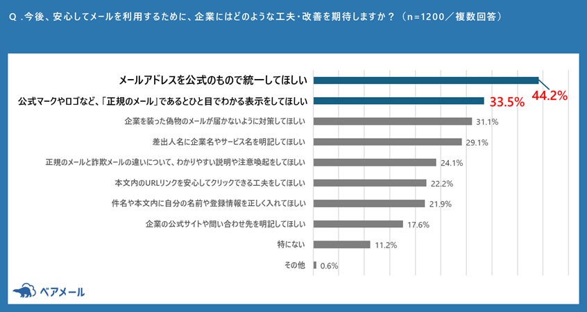 今後安心してメールを利用するために企業に期待する工夫・改善としては、44.2%が「メールアドレスを公式のもので統一してほしい」、33.5%が「公式のマークやロゴなど、『正規のメール』であるとひと目でわかる表示をしてほしい」、31.1%が「企業を装った偽物のメールが届かないように対策してほしい」と回答しました。