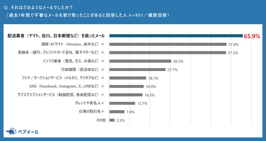 不審なメールの種類としては、「配送業者を装ったメール」が65.9%と最多で、