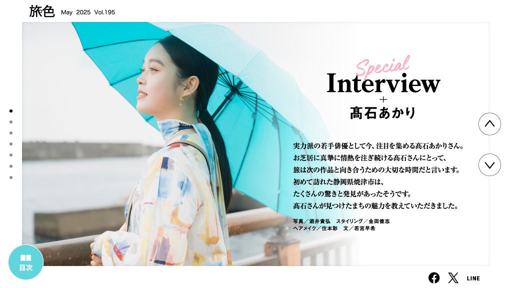 株式会社ブランジスタメディアは、表紙に髙石あかりさんを迎え、静岡県 焼津市と提携し、同市の特集を掲載した電子雑誌「月刊 旅色」2025年5月号を本日公開しました。髙石さんが焼津市を巡る旅の様子のほか、万博でにぎわう大阪市、日本に初上陸したヒルトンの最上級ラグジュアリーホテルなどを特集します。