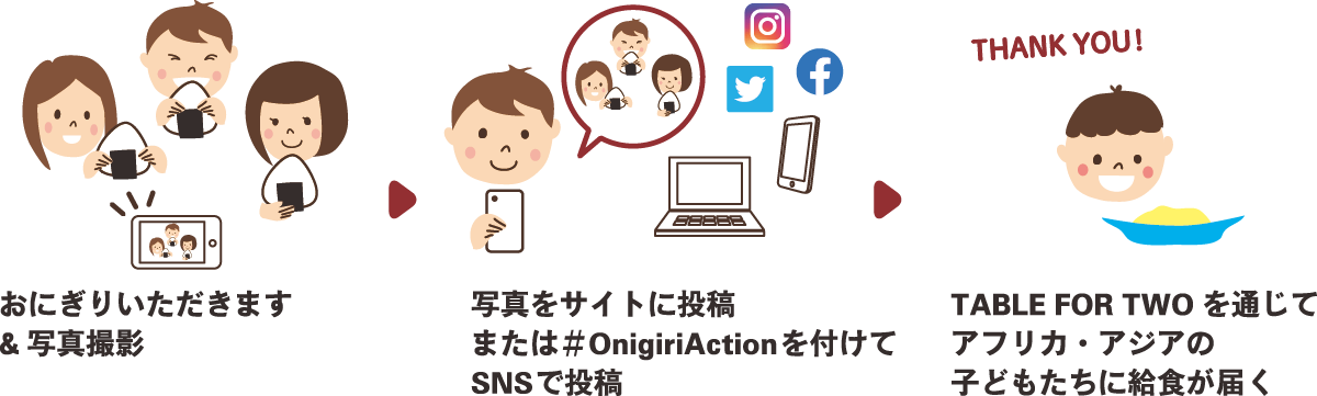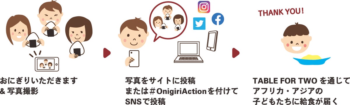 おにぎりアクションは、日本の代表的な食である「おにぎり」をシンボルに、「おにぎり」の写真をSNS(Facebook, Instagram, Twitter)、またはおにぎりアクションの特設サイトに投稿すると、1枚の写真投稿につき給食5食分に相当する寄付(100円)を協賛企業が提供し、アフリカ・アジアの子どもたちに給食をプレゼントできる取り組みです。( https://onigiri-action.com/ )